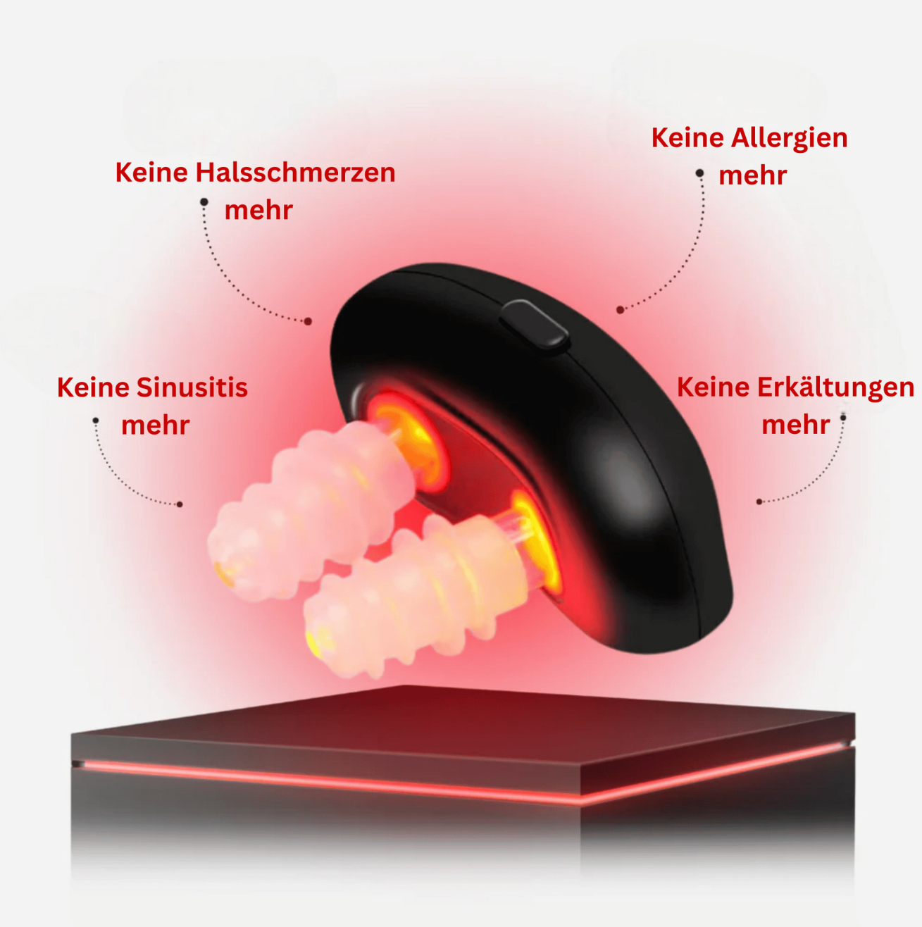 Das NasoLume Pro™ sendet präzise Wellenlängen von Rotlicht (ca. 630 nm) und nah-infrarotem Licht (ca. 850 nm) aus. Diese dringen tief in Gewebe und Nasenschleimhäute ein.